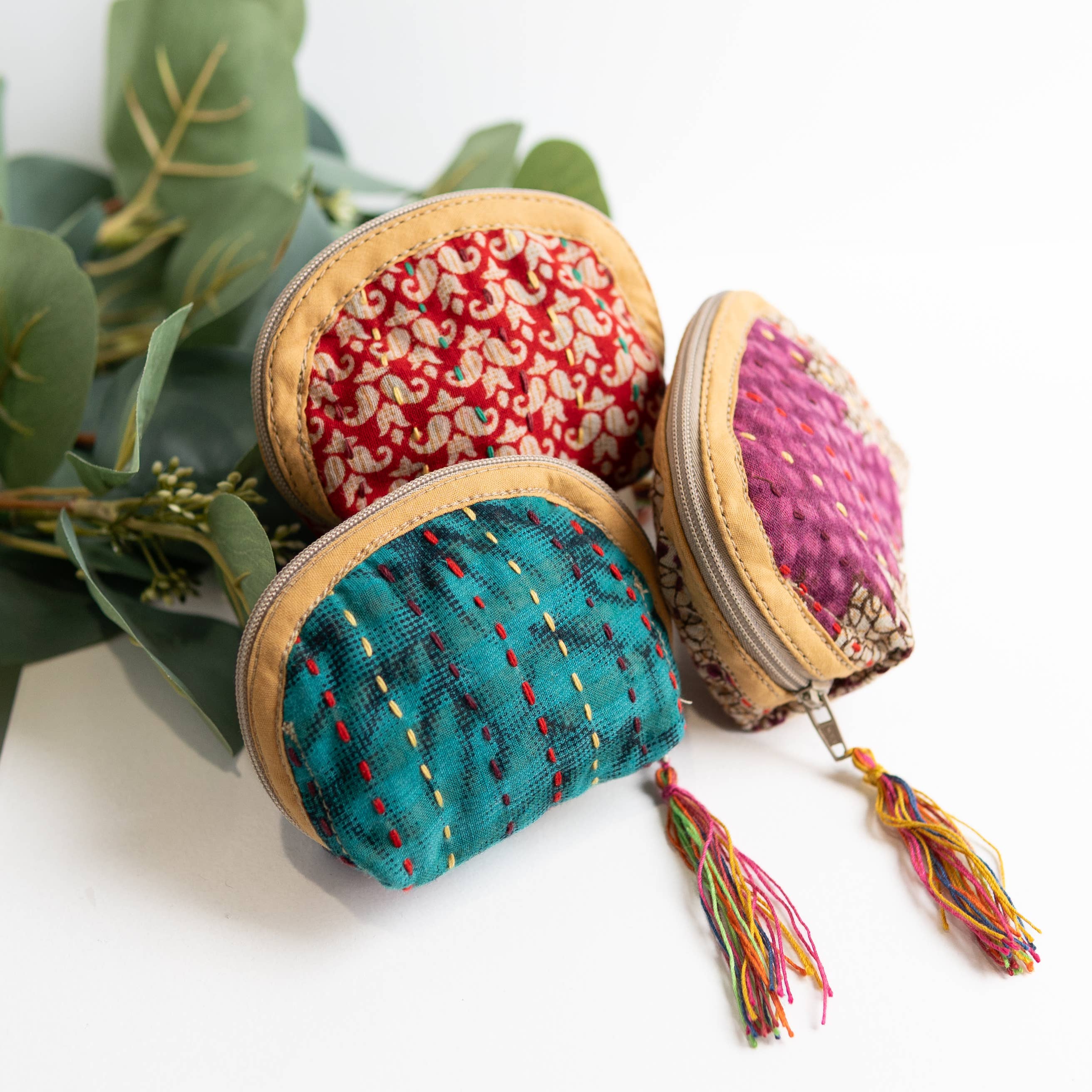 This tiny bag is handmade from upcycled Kantha quilts and is finished with a decorative tassel on the zipper. This stash bag is perfect for organizing small cosmetics, headphones, or charging cords.Each bag is crafted from upcycled cotton Kantha textiles, so colors & patterns will vary. Each bag is one-of-a-kind. Give a ethical & sustainable gift this holiday season! This bag makes the perfect gift for Christmas 2025 or stocking stuffers. • Measures 4.5" at widest and 3" tall. • Sustainably handmade by women artisans in Bangladesh.