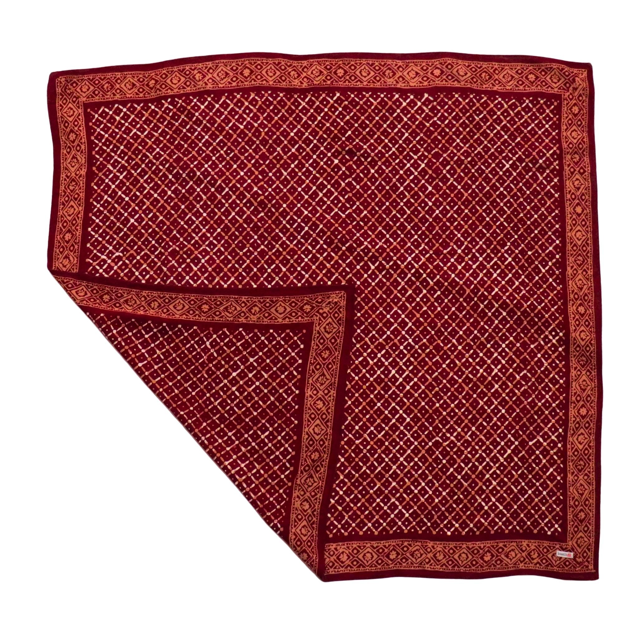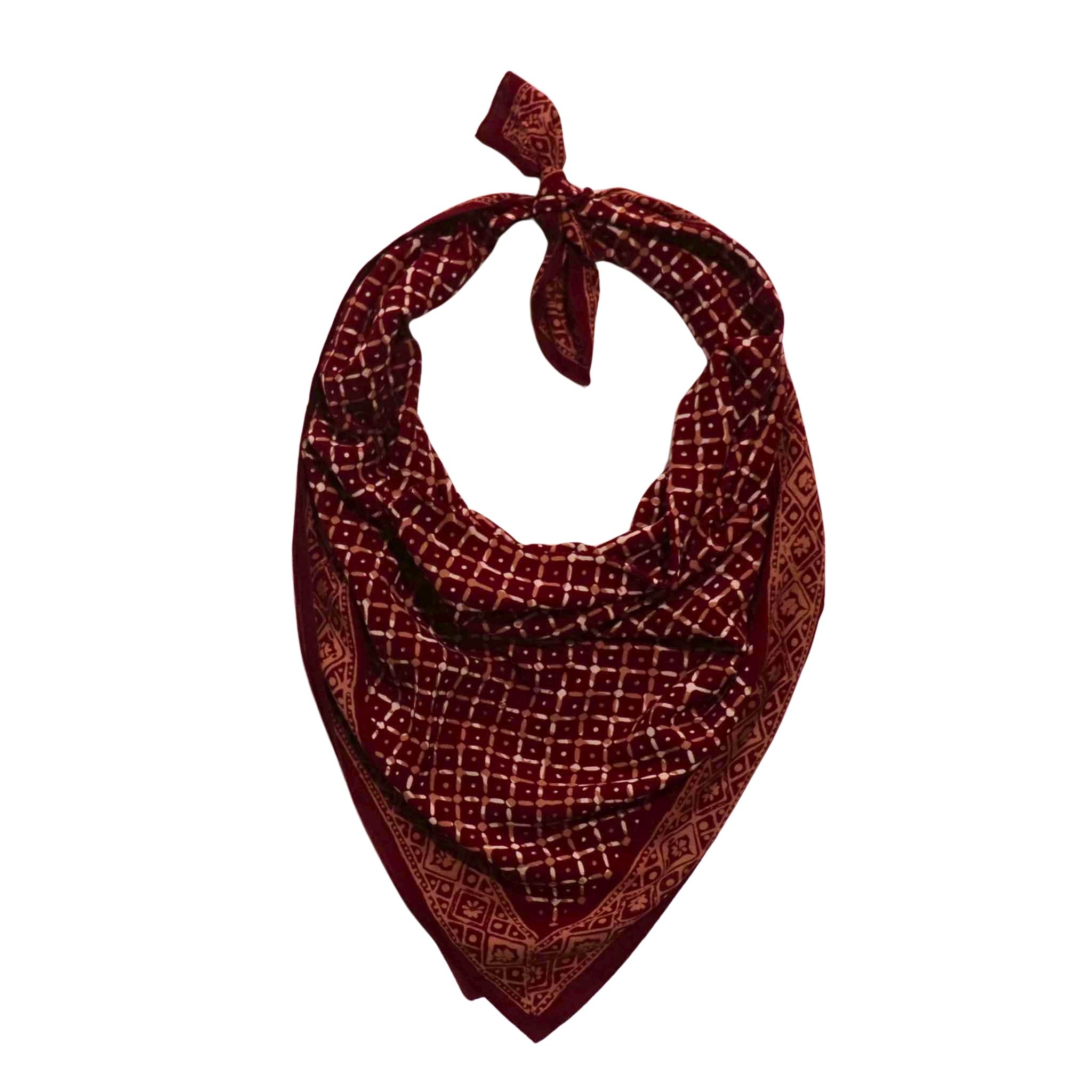This is an oversized 39" 100% cotton batik bandana. It is hand-dyed and hand-stamped batik bandana, handmade by artisans in Indonesia. This square scarf is handmade by artisans in Java using centuries old wax & dye batik technique. This fabric is made from soft lightweight bandana fabric. This bandana is made from white cotton fabric that is then hand-stamped and hand-dyed using 700 years old batik wax and dye technique. The batik fabric is also then sun baked. You should expect some variation of the color. This pattern is called Crimson Cross. Red, Maroon, Size: 39”x39” Due to the pre-washing process and the use of hot wax in its creation, our bandana may have slight variations in shape, resulting in a non-perfect square. This minor shrinkage is a natural part of the traditional batik process, adding to the uniqueness of each piece. Larger than our normal size batik bandana of ~22". XL bandana. Bandana top.