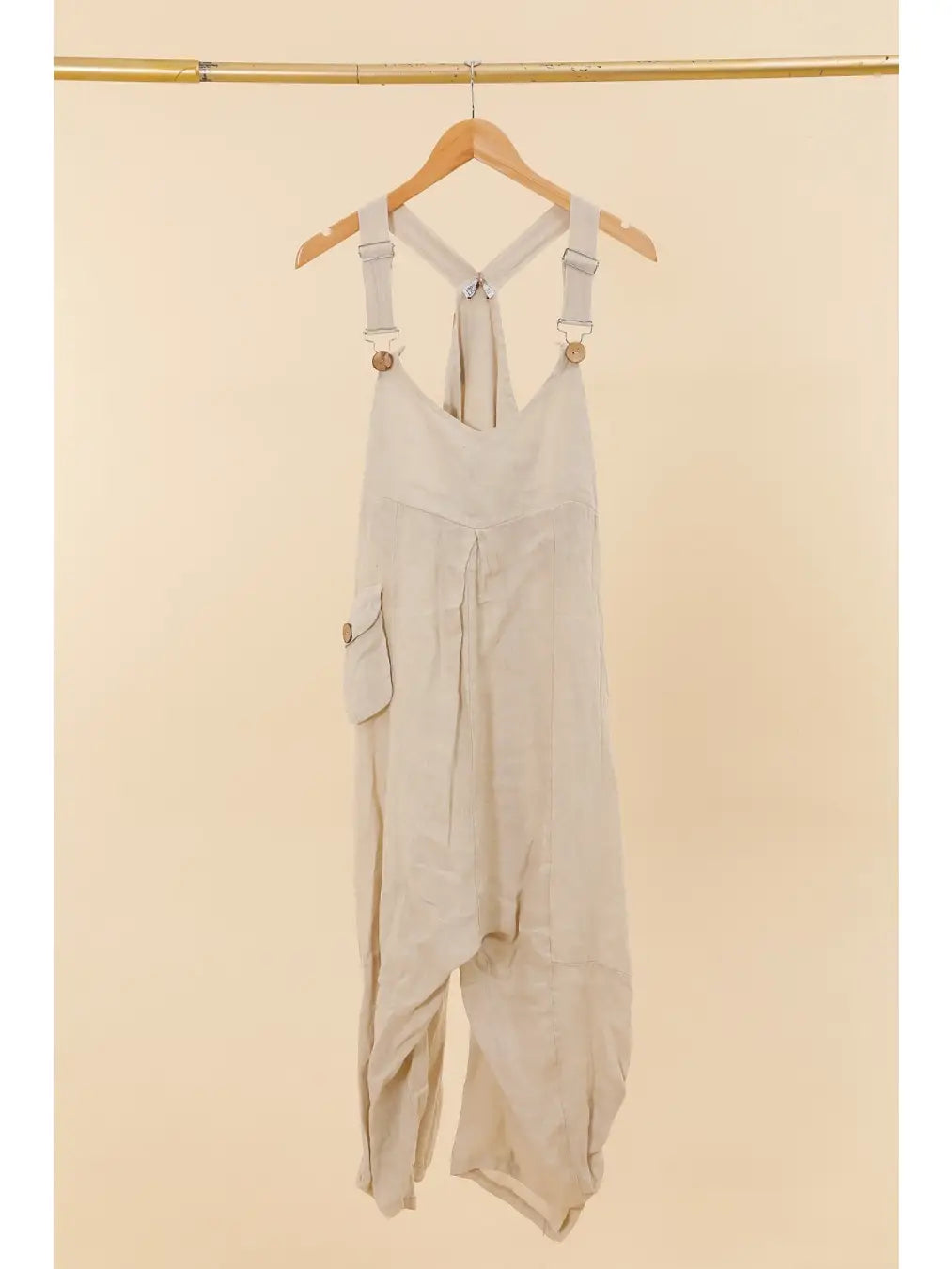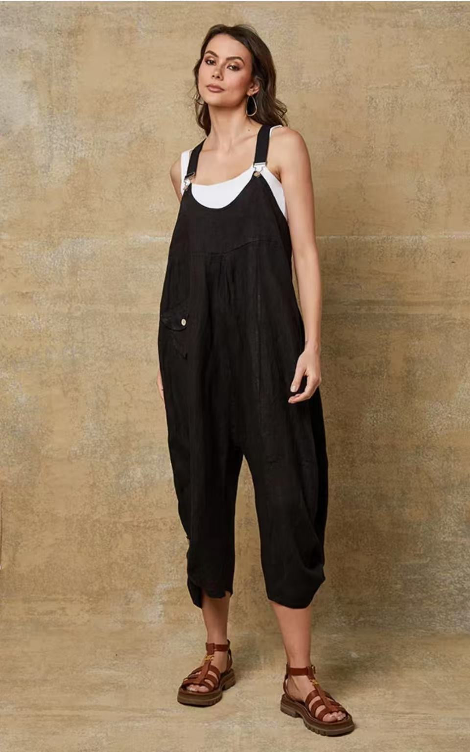 Nyack Jumpsuit – 100% Linen Bohemian Comfort. Effortlessly chic, the Nyack jumpsuit is crafted from 100% linen for a breathable, fluid fit that moves with you. Its relaxed, bohemian silhouette features adjustable straps with metal buckles, a buttoned side pocket for practical flair, and a slightly asymmetrical hem for a modern touch.