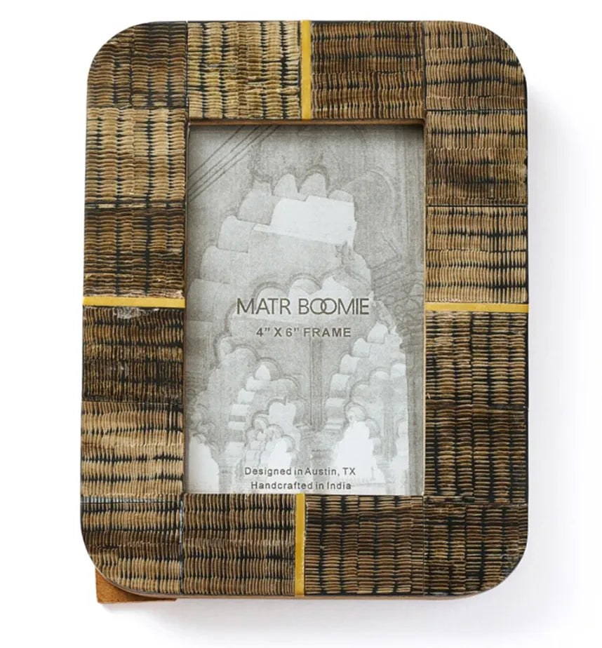 - Handcrafted by master artisans in India the frame features a two-way easel back, metal swivel tabs to access opening, glass cover and a metal d-rings for hanging vertically and horizontally.