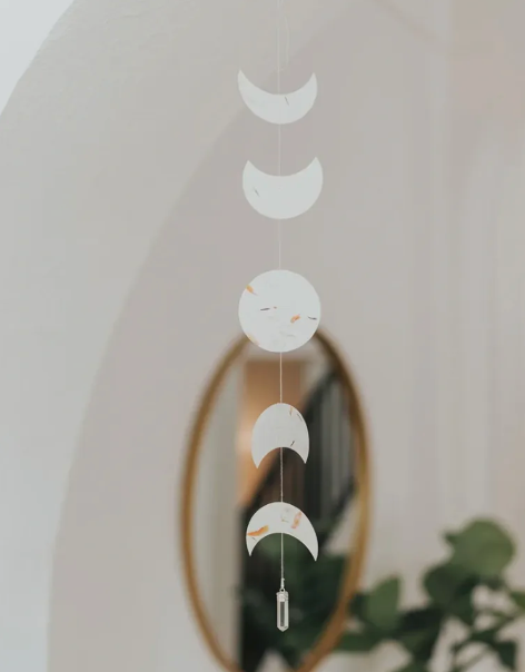 Eco-Friendly Moon Phase Garland with Quartz Crystal. Celebrate sustainability and craftsmanship with this enchanting moon phase garland, a meaningful gift made by hand with love.