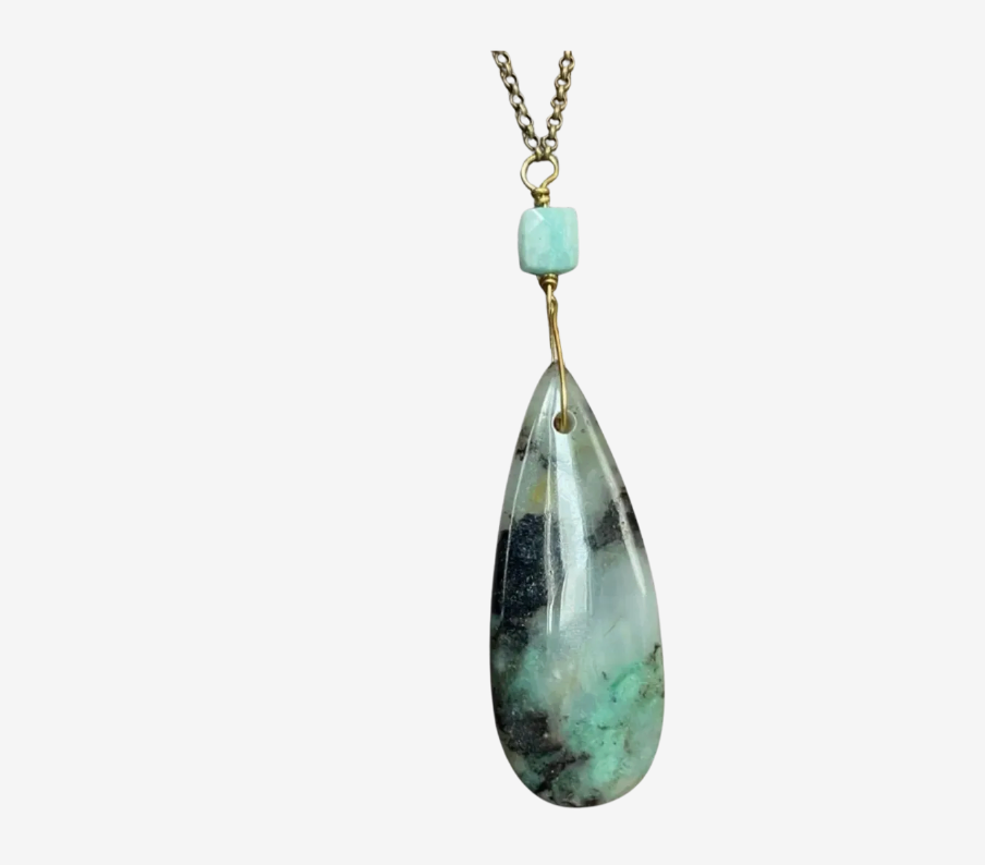 The Ada Necklace is a statement piece that shines on its own or layers beautifully with others. Choose from semi-precious stones such as Emerald Jasper, Labradorite, Leopard Skin Jasper, or Amazonite, each capped with a coordinating cube. Wear it long with a favorite tee, or shorten into a lariat style over a V-neck—versatile by design.