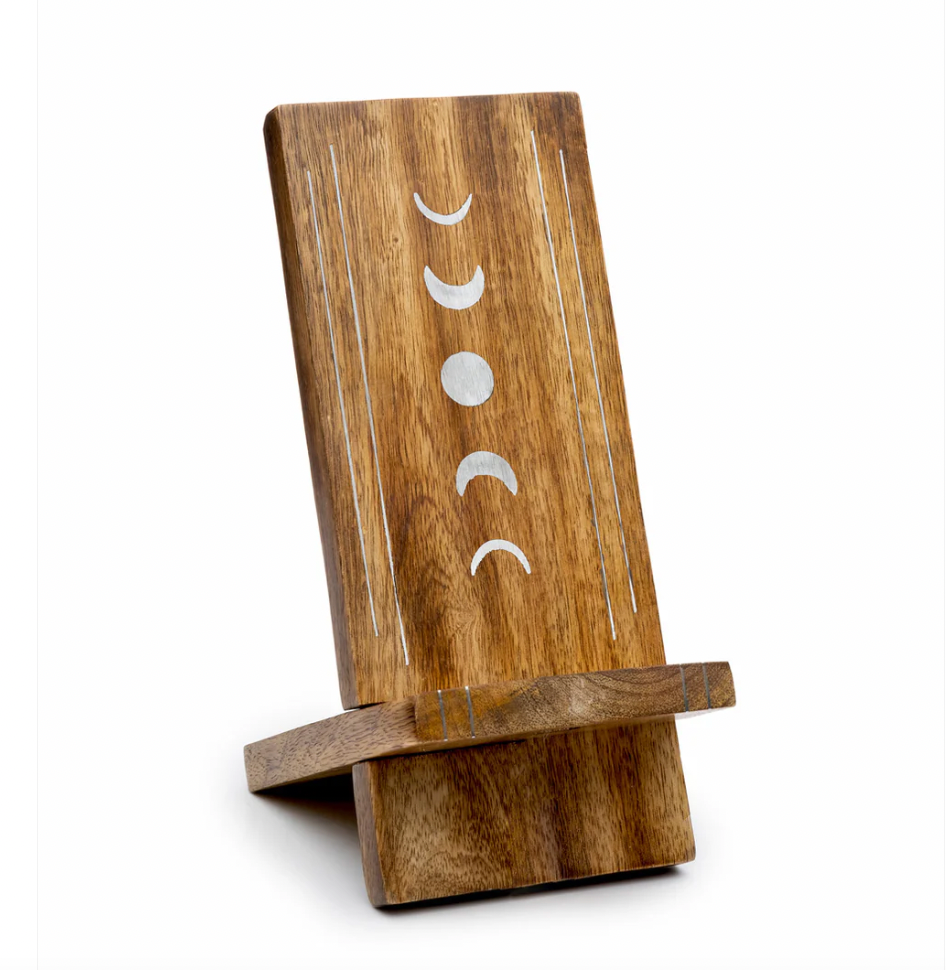 Expertly handcrafted from sustainably harvested mango wood, this piece features metallic moon phase inlay design. This phone holder serves as both a functional stand for smartphones and a decorative piece that adds a touch of celestial charm to any desk or nightstand.