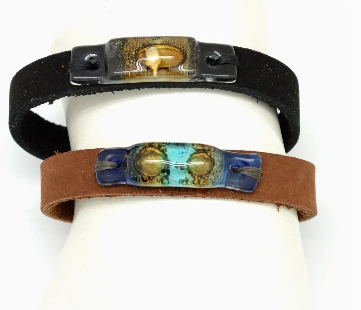 Skinny Fused Glass & Suede Bracelet – Modern Elegance. This sleek and stylish bracelet combines the modern appeal of fused glass with the soft texture of suede leather. Its minimalist design makes it a versatile accessory for any outfit, whether casual or dressy. The secure snap closure ensures a comfortable fit. Assorted.
