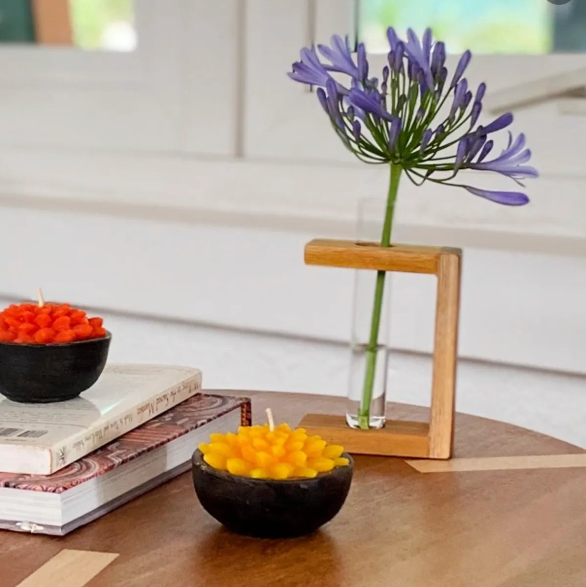 This charming test tube vase features a unique 3-sided design, blending teak wood and glass for a modern and elegant look.