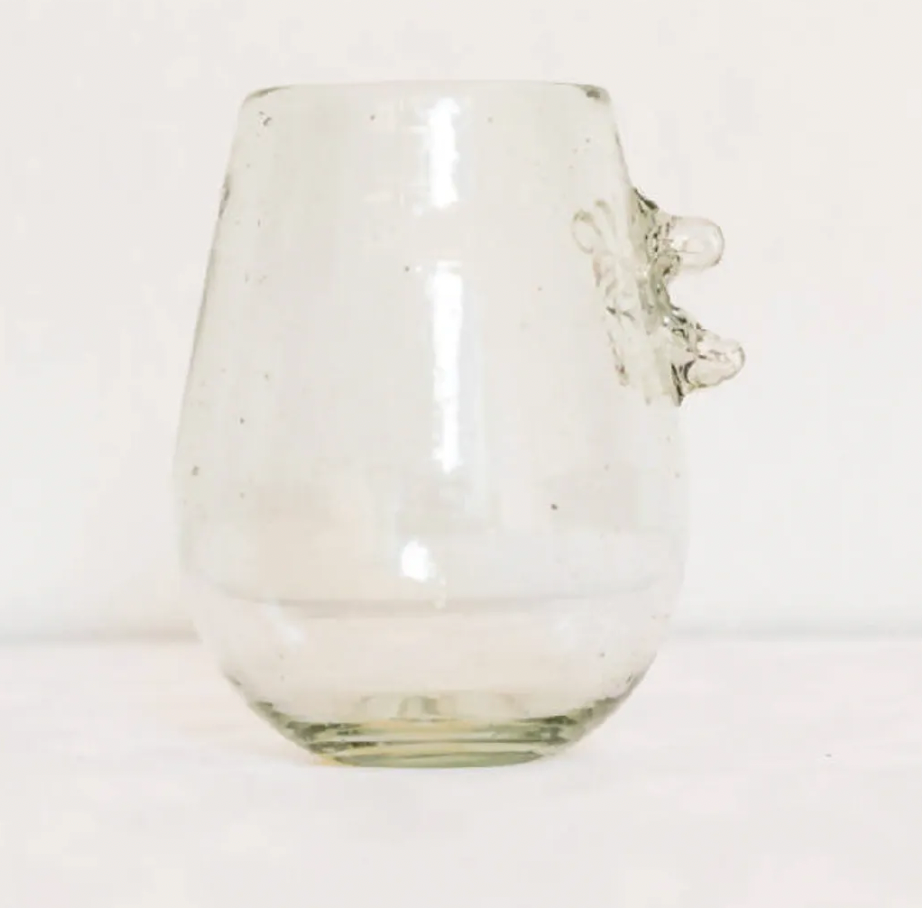 Handblown with meticulous attention to detail from 100% recycled glass, each piece carries its own distinct charm and character, reflecting the artistry of the craftsmen behind it. Standing at 4" tall with a diameter of 5", these glasses may vary slightly in size, bearing the hallmark of their handmade origins.